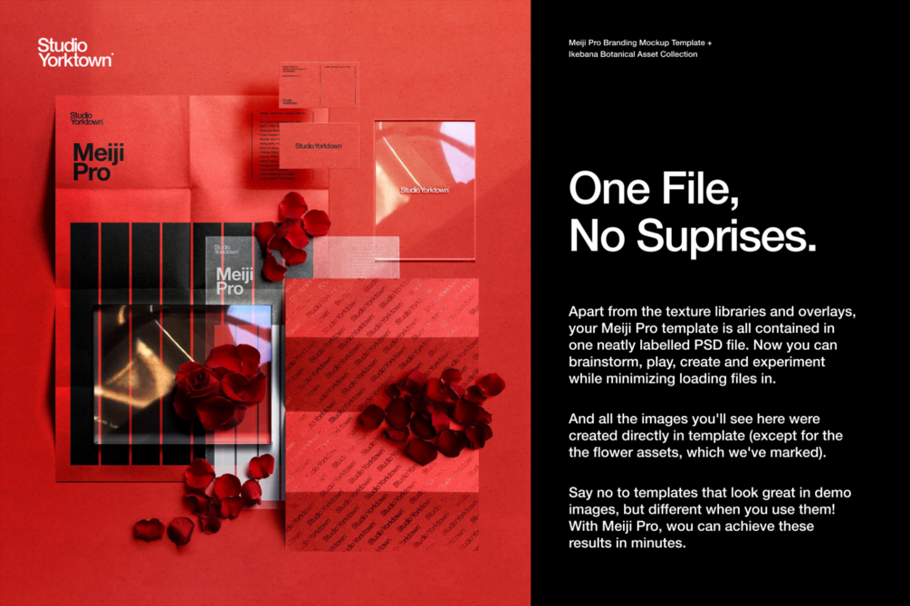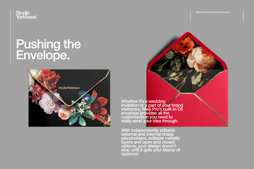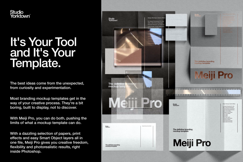 Meiji Pro is an all-in-one branding mockup scene creator for Adobe Photoshop. With unparalleled versatility and material effects, it’s a tool and a template built for design, display and discovery.